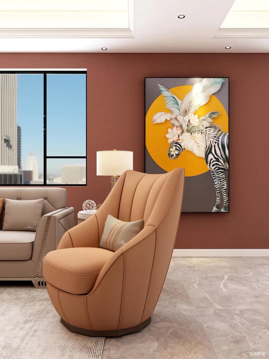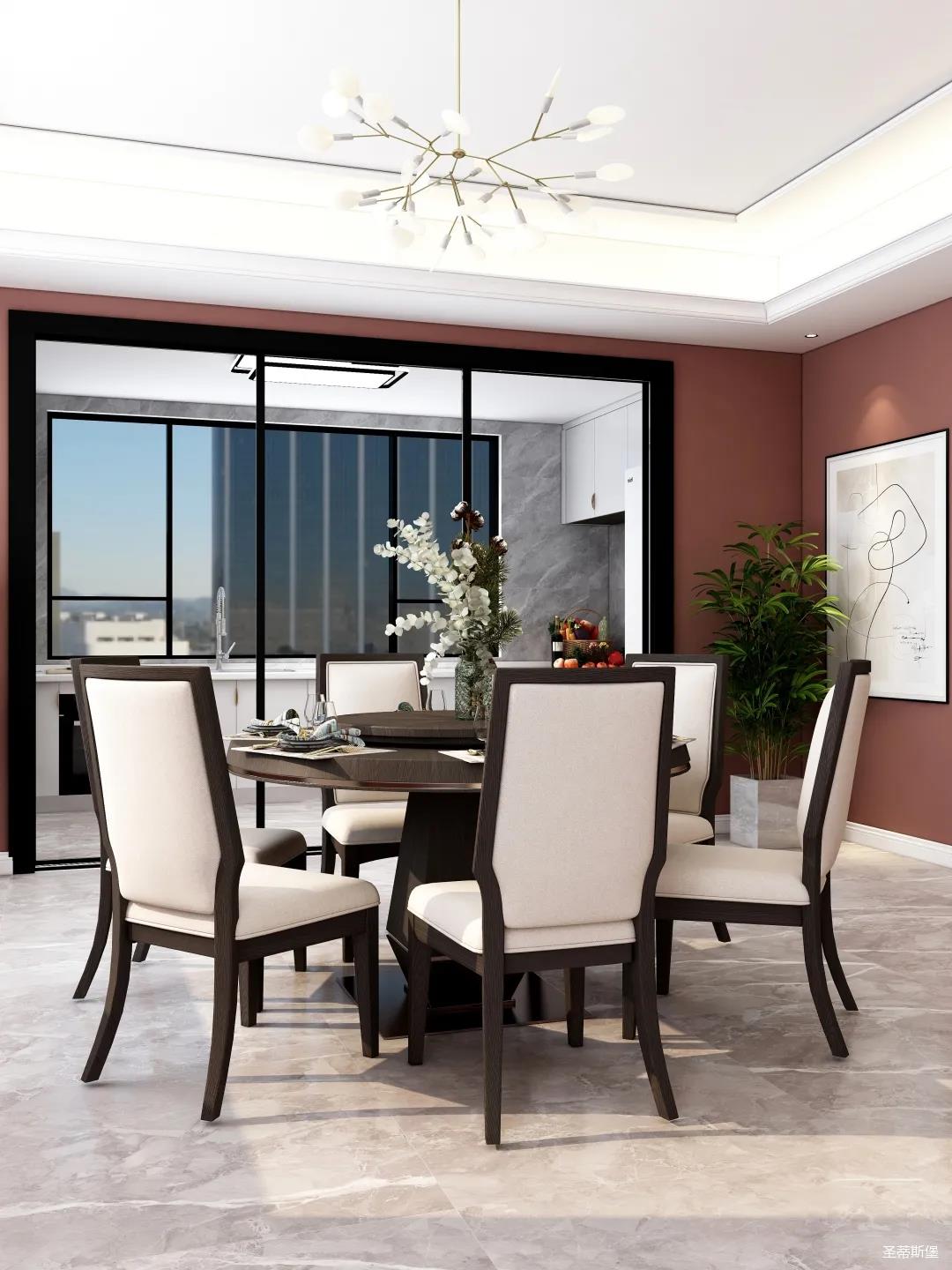 表姐不喜歡大白墻設(shè)計(jì),于是設(shè)計(jì)師完美貼合表姐的喜好,摒棄了傳統(tǒng)的大白墻,將色彩跳躍的鐵銹紅應(yīng)用于空間,從視覺上豐富了空間的層次感。南北通透的空間布局,讓視野更為清透明亮。