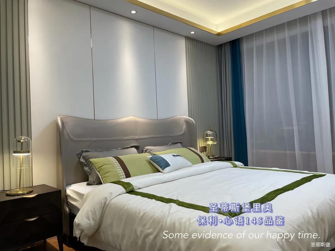 ▲次臥選用拼色,傳達(dá)出一種空間平衡美。這里的色彩相比于主臥更加平緩,視覺上也多了份輕巧。床屏與背景飾面組合出疏密有序的線條比例,詮釋著一個(gè)精工而不流于艷俗,純凈而不至于過渡簡(jiǎn)約的精致臥房。