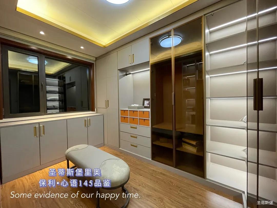 ▲衣帽間是用一間房改造的,衣柜開放式的布局處理,不但釋放了空間的狹隘,也營造出了具有觀賞性的空間格局,淺灰色調(diào)打造柜體基底,凝練出現(xiàn)代簡(jiǎn)約的生活質(zhì)感。柜體中安裝感應(yīng)燈帶,光線流瀉其中,襯托出材質(zhì)的自然肌理,溫潤細(xì)致的實(shí)木與剛硬冷冽的低奢金屬相互交織出一個(gè)極具質(zhì)感的儲(chǔ)物空間。