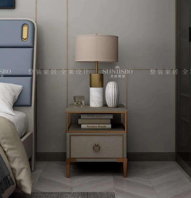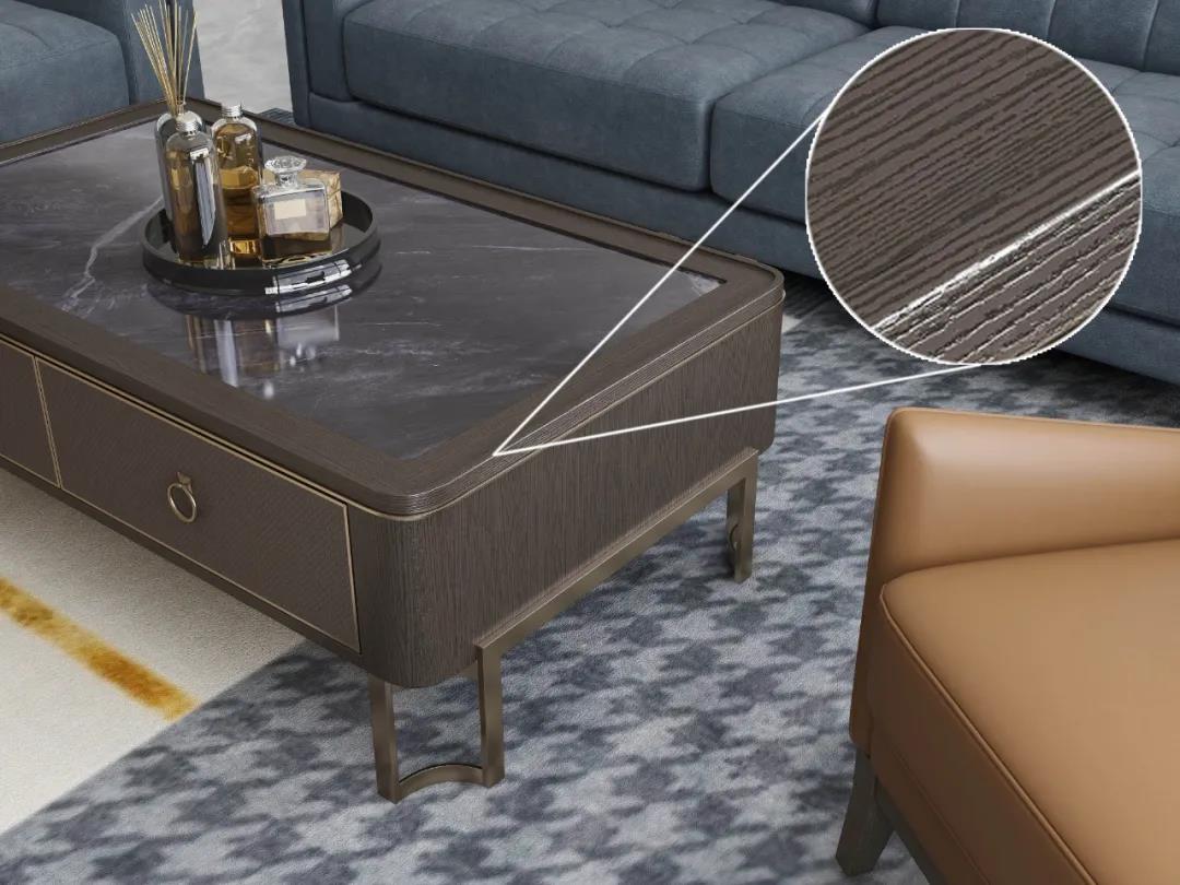 洛斯系列在現(xiàn)代時尚的基礎上還增加了許多輕奢的金屬元素,金屬元素在輕奢風里毋庸置疑的存在。為什么人喜歡戴耳環(huán)、戒指、項鏈等首飾?為什么衣服、鞋子、包包上都能看到金屬元素的身影?從時尚圈到家居界,金屬元素憑借其獨特的質(zhì)感以及由內(nèi)散發(fā)的高級氣質(zhì),有著強大的包容性,提升風格格調(diào),增添時尚氣息。運用在家居中可成為整個空間的亮點,成為時下家居裝修的潮流趨勢,深受大家的喜愛。但是目前市面上采用金屬鑲嵌工藝的多數(shù)是在板木結(jié)合的基礎上,難度相對簡單易操作。在洛斯系列里,是在實木的基礎上進行金屬鑲嵌工藝,要求精準度非常高,誤差不得超過0.5毫米,不然就會對不齊。在洛斯系列中,桌子的四角與腿部、柜類門板,沙發(fā)腿部,茶幾支架,餐桌臺面,床品外框等都將金屬恰到好處地融入到空間的每個角落,讓空間擁有輕奢的高級感,提升空間的質(zhì)感。將優(yōu)雅謙遜的都市精致感全面呈現(xiàn),讓裝修冷中帶暖、沉靜精致,也向人們展示了一種精致的生活方式,更為整個家注入靈動氣息。
