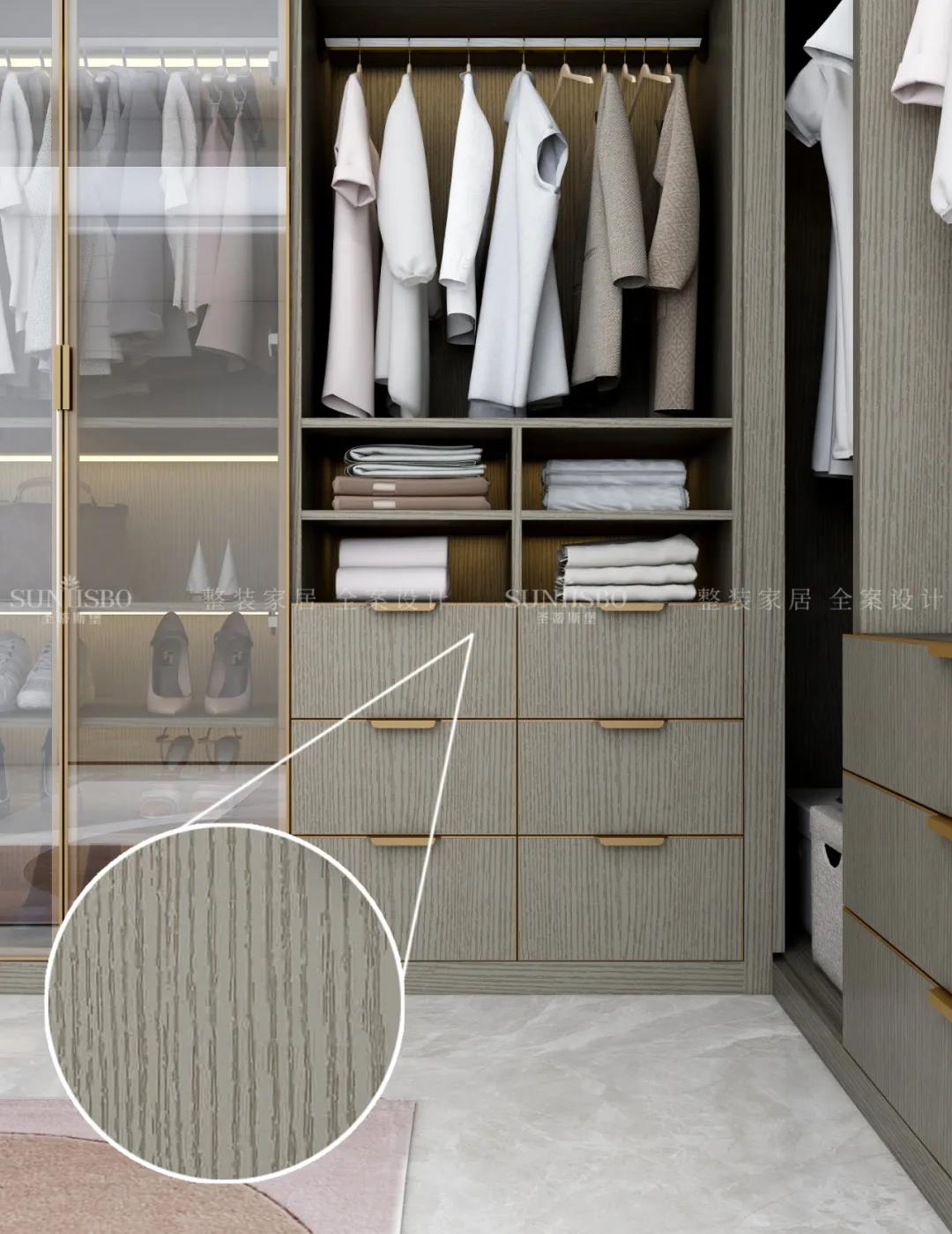 當下人對原生態(tài)材質(zhì)的極致追求也是當下人回歸自然的一個方式,現(xiàn)在很多高端的精裝房墻上都是木飾面,這些木飾面都是貼木皮或者帶木紋的產(chǎn)品,洛斯系列采用紅橡直紋的實木壓紋工藝,使木紋呈現(xiàn)河流的波紋狀,第一可以保持很好的原木的質(zhì)感的同時,也能夠給空間帶來一種靈動感,不會顯得呆板與單調(diào)。由于木面的半開放式涂裝,表面凹凸不平,深淺有致的設計,使產(chǎn)品在燈光下產(chǎn)生漫反射的光線折射,降低了整體產(chǎn)品和空間上的高光感,使人在心理上有更加柔和感受,更加有生活的氣息,就像亞麻質(zhì)感的面料會讓更多的人接受;與市面上大部分輕奢的鋼琴烤漆相比,鋼琴烤漆的表面是平整光滑的,因此在光線下呈鏡面反射,雖然看起來會有奢華的效果,但是如果放在家里則會給人帶來冰冷與距離感。