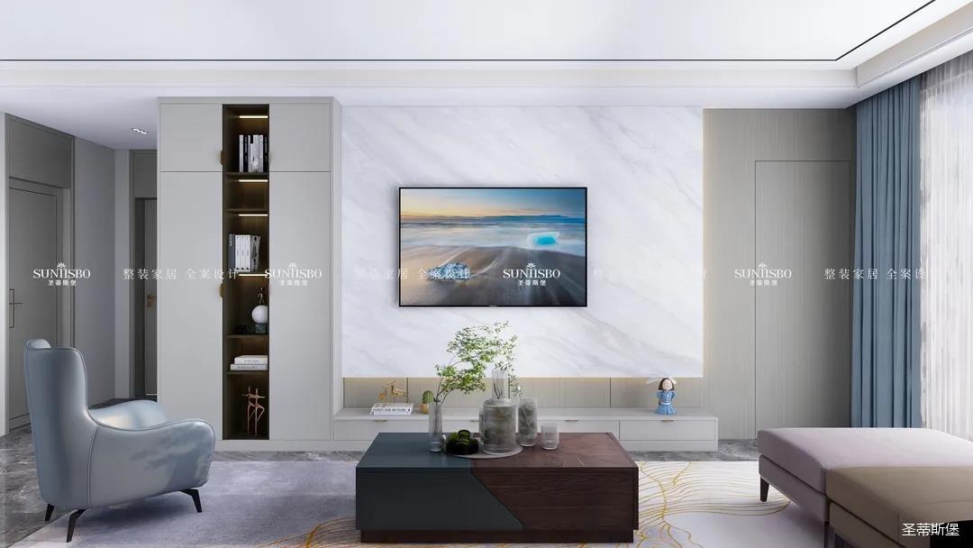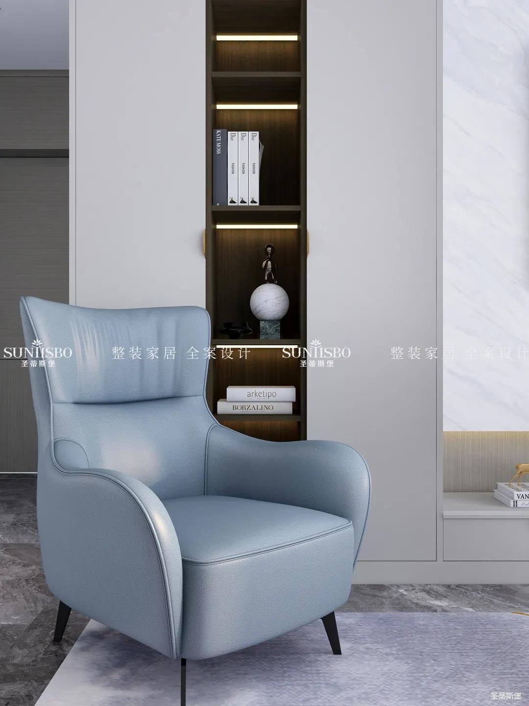 優(yōu)雅淺灰L型定制柜與紋理清晰的大理石組合電視墻,滿足了業(yè)主審美與實(shí)用的雙向需求。一張淡藍(lán)色的休閑椅,讓業(yè)主能感受到亮麗明艷色彩之外的獨(dú)特,低調(diào)不張揚(yáng),卻在溫潤中傳遞出色彩的力量。通過紋理清晰的護(hù)墻為底,為柔和優(yōu)雅的靜態(tài)客廳增添了層次感十足的空間律動。