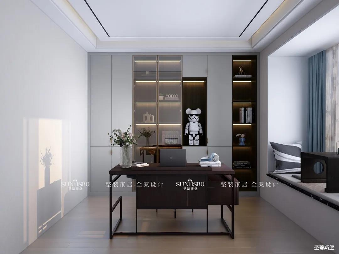 陽光透過窗戶悄然進(jìn)入,光影浮動間,實(shí)木書桌給書房騰出了一個(gè)安靜愜意的閱讀空間,偶爾放下書本,徑直探向窗外,慢享陽光里慵懶的味道。