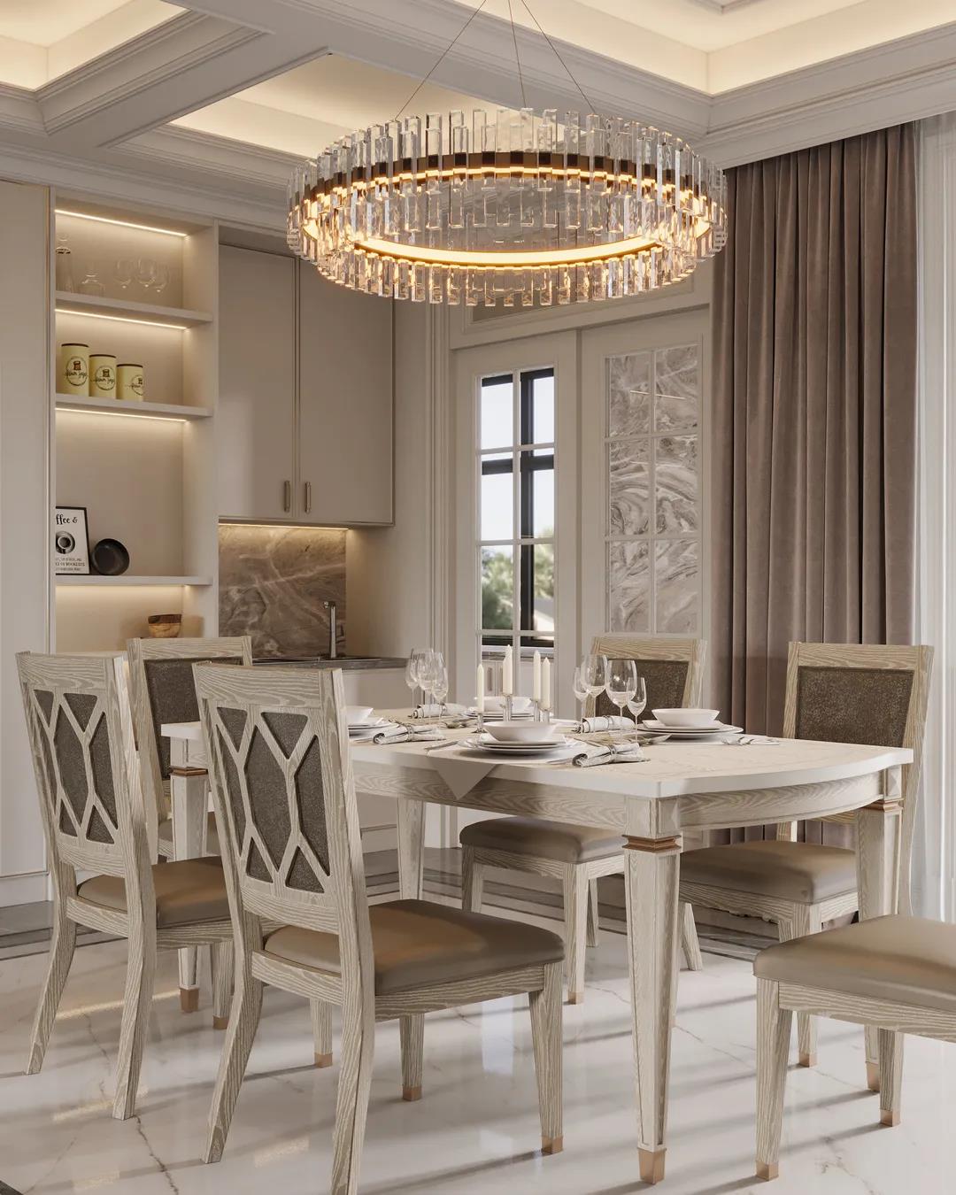 在華麗而精致的餐廳中,仿古白的餐桌椅搭配通透的水晶高腳杯,兩者交相輝映,用餐儀式感十足。墻面的護墻板和酒柜呈現(xiàn)一字型設計,一方面增添空間整體的豐盈感,還強調(diào)出個性現(xiàn)代的輕奢布局。