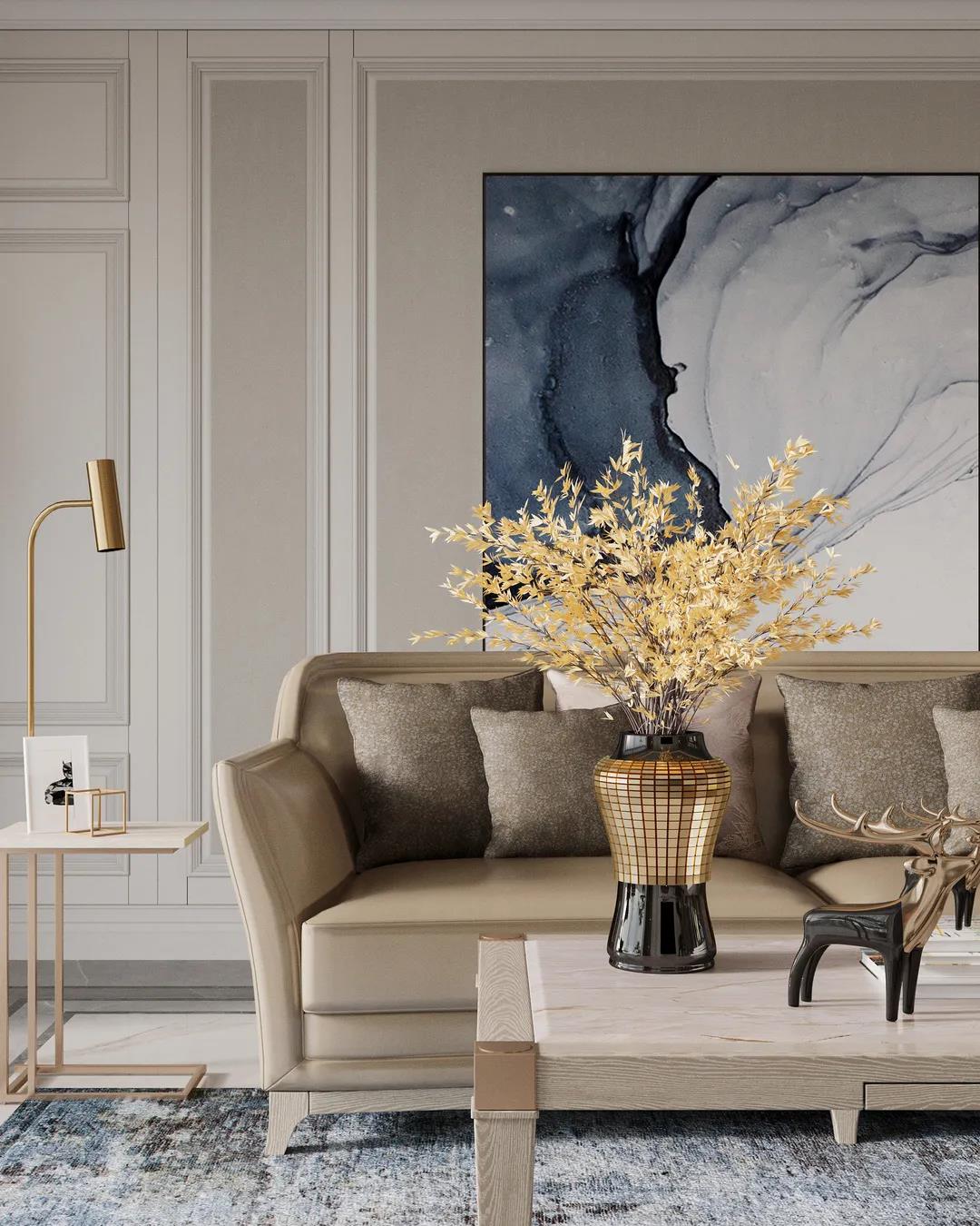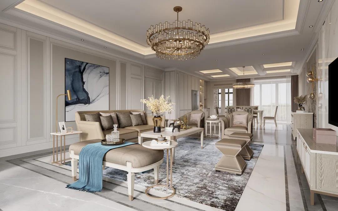 本案定位美式輕奢風格,設計師提取了業(yè)主喜歡的顏色添加至空間中,并運用金屬元素滲透到每一個空間,統(tǒng)一色調(diào)。在設計上,格局大而不空,以優(yōu)美線條雕琢空間語言,材質(zhì)肌理間的碰撞融合,打造出層次豐富的藝術感。