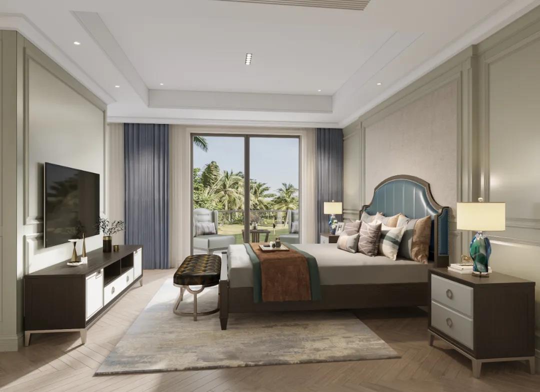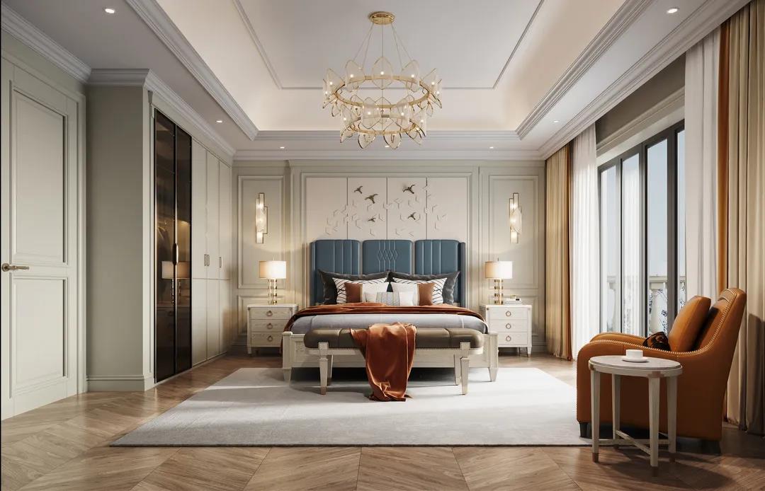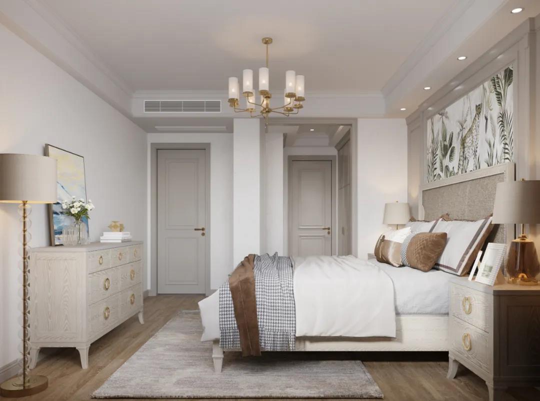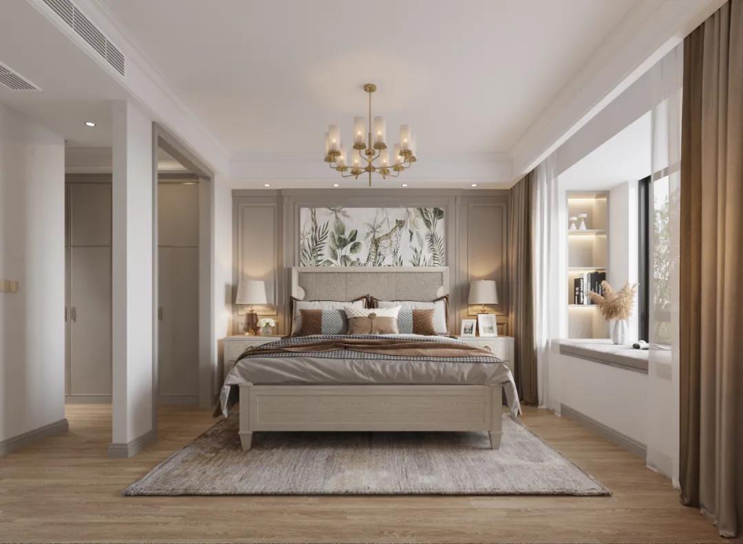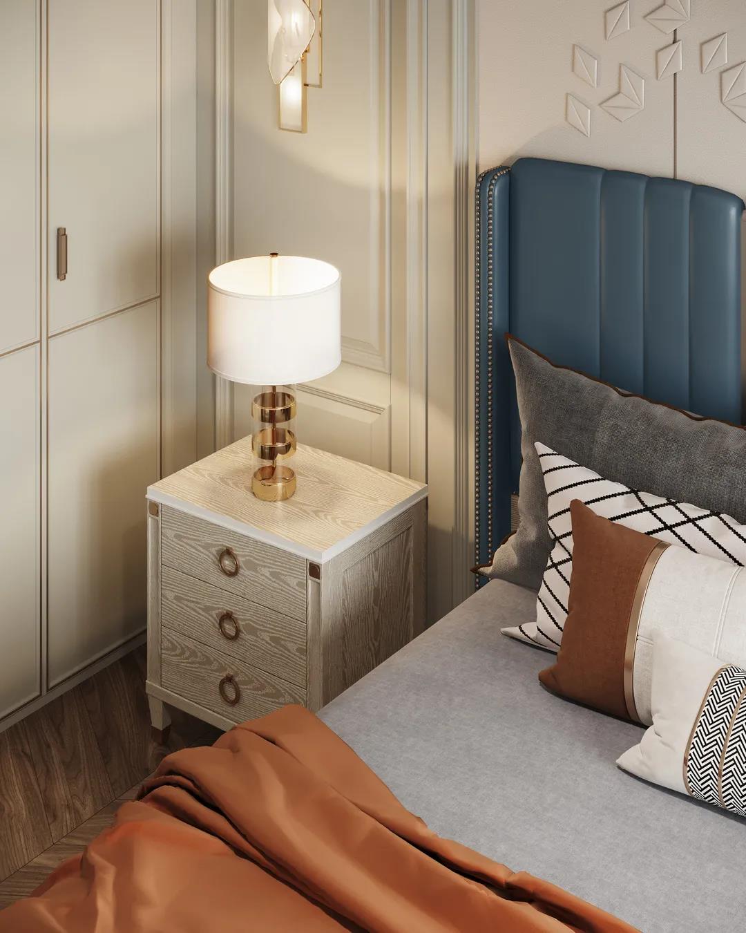 主臥以線條元素做主導,軟包的床頭墻面充滿安全感,浮雕的造型給空間布局帶來了極佳的層次感,以現(xiàn)代美式輕奢框架為主題,融入了美式靈動的線條,讓整個臥室既有時尚質(zhì)感,又有時光打磨后的穩(wěn)重。