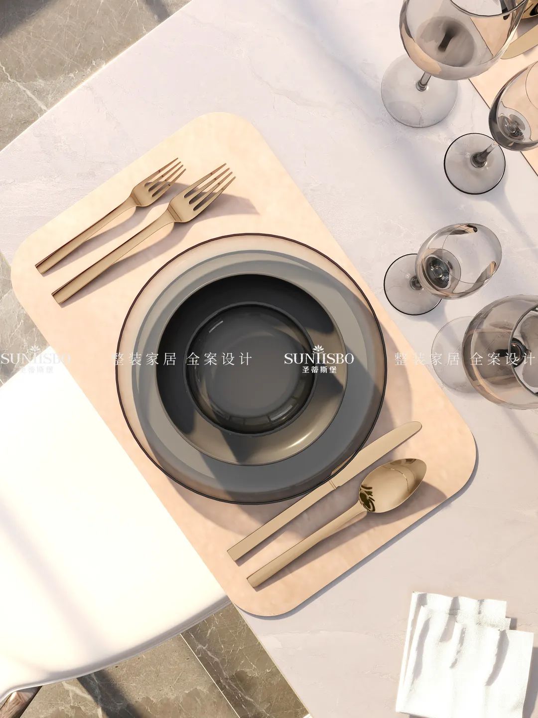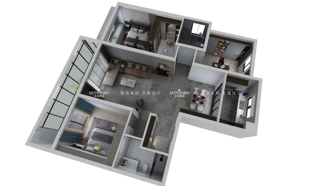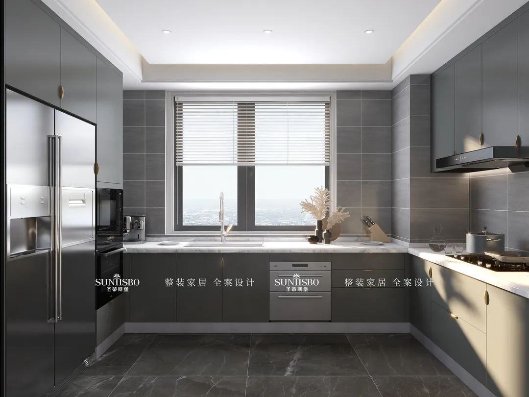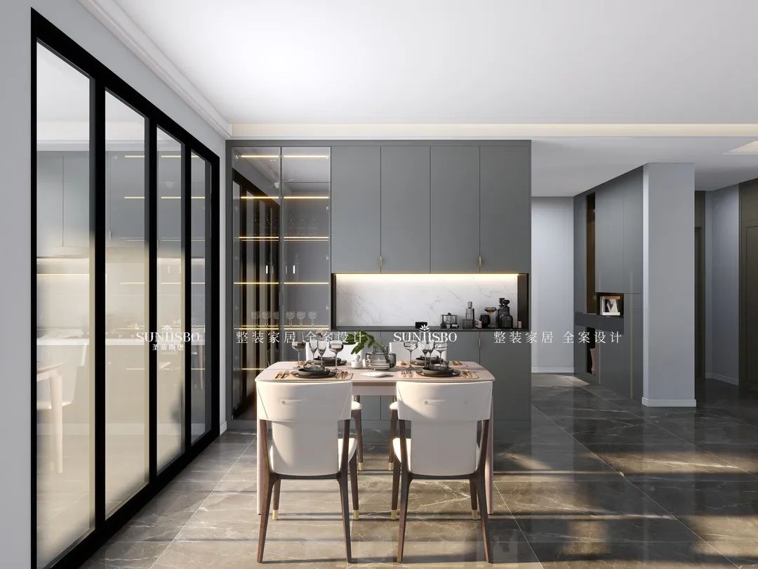 餐廳的設(shè)計采用整墻定制的餐邊柜,高級灰讓空間調(diào)性瞬間得到提升,半透明的玻璃展示區(qū),營造了多樣的空間和充滿極簡藝術(shù)氣息的生活體驗。