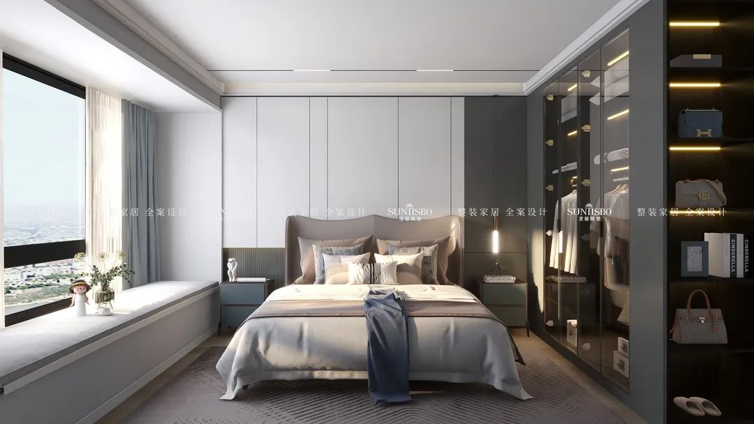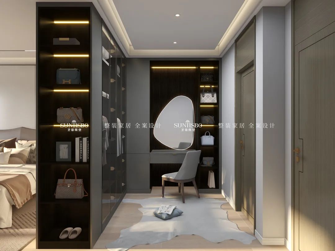 擁有一個專屬衣帽間是很多女生的夢想。設(shè)計師回歸生活本質(zhì),究其外,是空間;究其內(nèi),是材質(zhì)、燈光,內(nèi)外融合,比例和諧。通過不規(guī)則狀的玻璃鏡面設(shè)計,在時尚高級的定制空間中,傾訴著創(chuàng)意的真實和溫度,不僅擴大了衣帽間視覺范圍,同時也給予了空間個性鮮明的藝術(shù)格調(diào)。