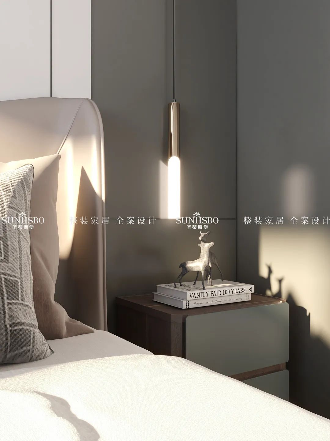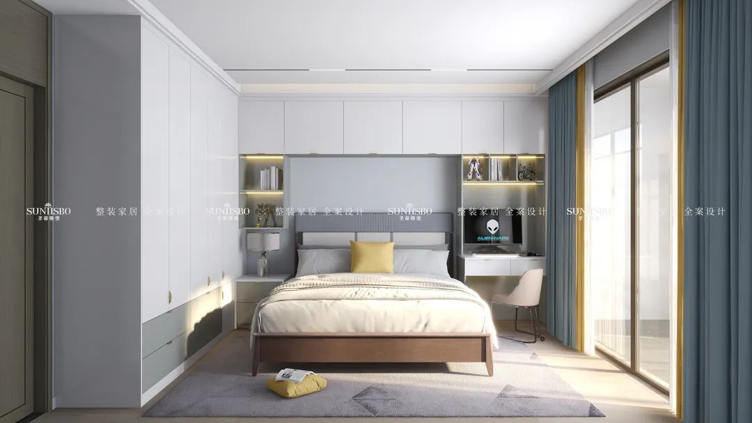 原色的木地板、淺灰的衣柜,搭配簡約的背景墻,整個空間都呈現(xiàn)著祥和靜謐的氛圍。游走的光影,絕佳的開闊視野,使得空間充滿無限張力。黃綠拼接的窗簾,配合柔和的層板燈,營造舒適溫馨的起居氛圍。