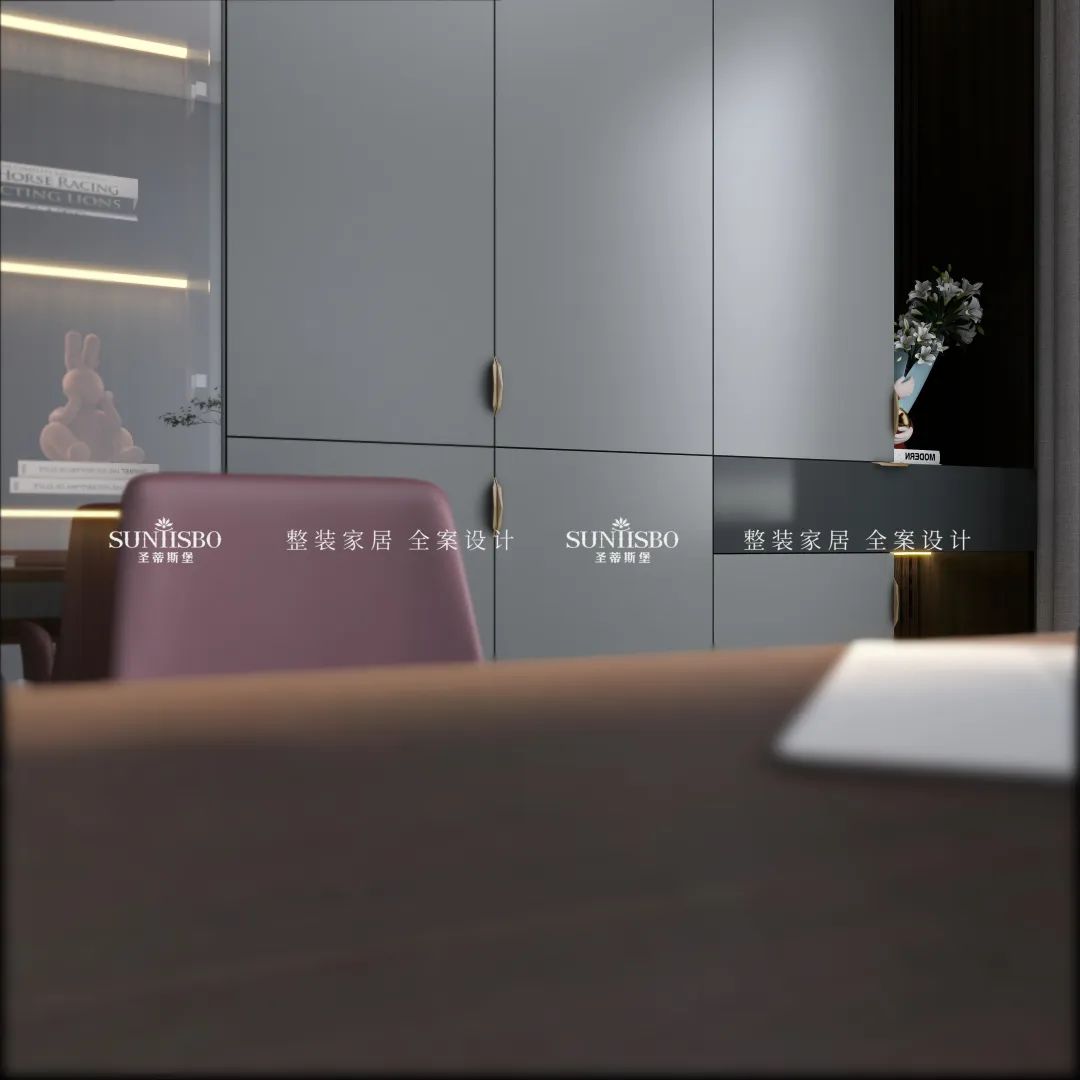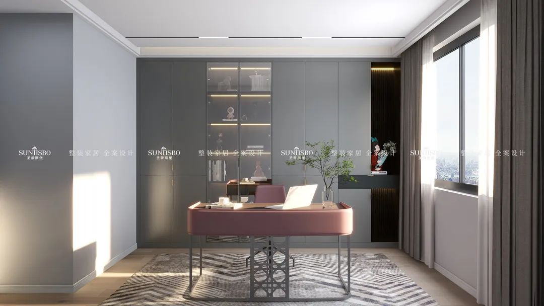 啞灰的定制書柜,冷靜理性,帶來思緒上井然有序的細密邏輯。天然原生的光感,讓視覺達到完美平衡。書房特意配上多裂綠植,讓現(xiàn)代簡約與傳統(tǒng)文化結(jié)合,萌發(fā)出別出心裁的設(shè)計,展現(xiàn)業(yè)主對傳統(tǒng)文化情結(jié)的喜愛。
